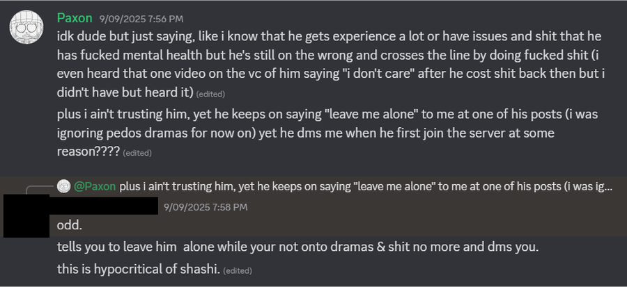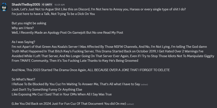 Again, Shashi, at the end of this post, I'm no longer sending you replies, making fun of you or whatever it is, I'm still officially moving on from pedo dramas, ignoring and not pay attention to them no more including you that I'm focusing on my mental health healthy since ignoring helps me out which I would recommend that you should keep your mouth zipped since the supporting Takwa's teleiophilia artworks and you doing a pedophilia act happened, specially harassing them and sending gore as a weapon, if you want to change fully that you won't scream and smash your mic, maybe you should inactive your accounts (best tip, delete it), go outside or focus on any positive activities (like rewatching childhood cartoons, drawing or maybe hell, find a hobby which is cooking for example) so you won't keep harassing and even grooming anyone anymore as a favor. Keep in mind, would recommend that you keep your mouth quiet and be grateful that I'm not gonna make fun of you or giving you warnings and replying you back anymore since I'm ignoring the pedo and teleiophilia dramas anymore that you "want me to leave you alone." I hope I've actually made that clear, thanks for reading the last post I'm ever gonna give you.