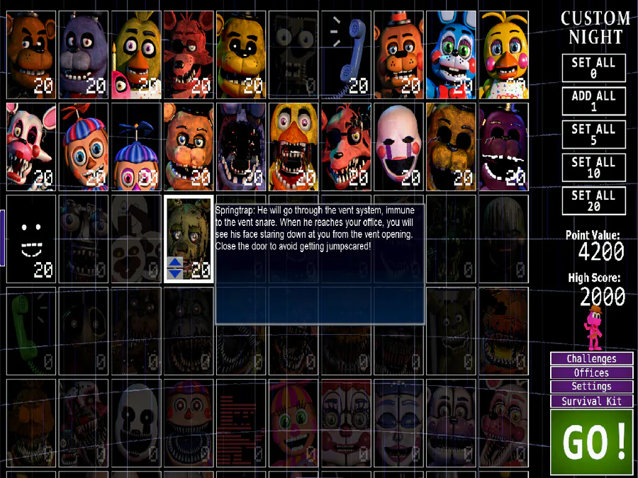 Dark Springtrap: He will come through the vents and the left door. Use the audio distraction to prevent your death, he is inmune to the door, door vent, and vent lure.
