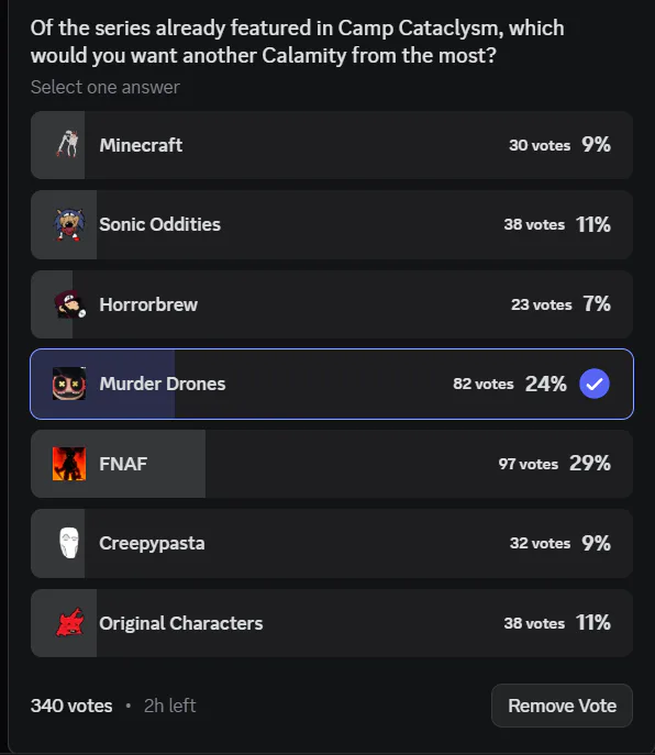 This poll asks the CC discord server "Of the series already featured in Camp Cataclysm, which would you want another Calamity from the most"