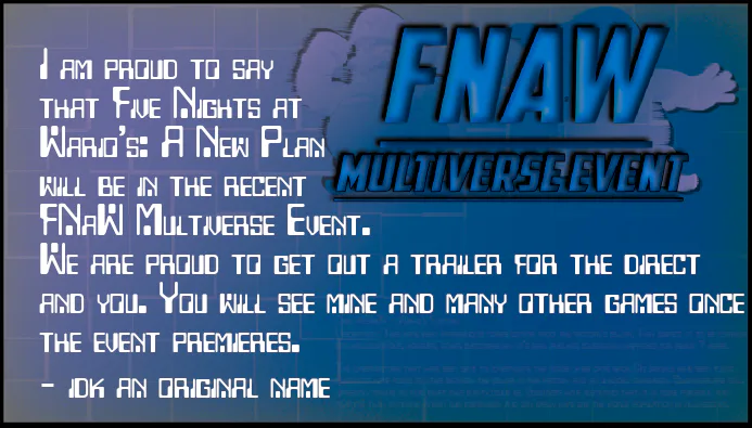 Hey all, this is a very important 2 update announcement about the future of Five Nights at Wario's: A New Plan. We have some to discuss so let's go.