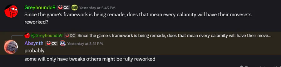 Since CC's going through a recode, calamities will either have their movesets completely reworked or slightly changed.