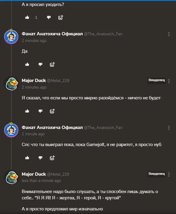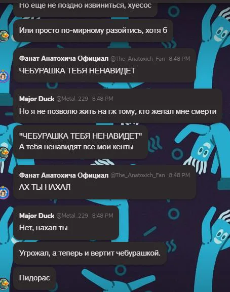 Угрозы смертью, неадекватное поведение, оскарбления, защита тех, кто проебался и уёбичный характер
