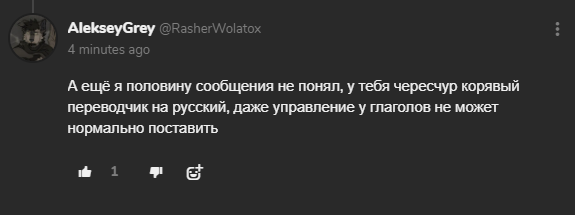 RUS: Пока я занимался делом переводом по-русски на этого игра от разработчика друга. И вот пошло все пизду, пришла комментов мне о том что я "корявый переводчик на русский", вот этот серьезно тему. и потом я ему *** послал за такой базарь выдавать. И потом дальше я занимался и снова опять пришла комментов ответ мне "Ребёнок заплакал, писать ещё не умею и уже рычит из-за того, что услышал факт о том, что его корявый русский не нужен арабам и испанцам"! Я был бешенстве и хотя однако сама она не поняла @AngelCAI