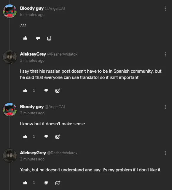 ، سألتني: "فقط لأعرف... هل تتحدث الإسبانية؟". في الحقيقة، لم تكن تتحدث الإسبانية لأنني كنتُ غبيًا وبقيتُ على GJ! لكن لا يهمني. أنا الوحيد الذي يقول الحقيقة. ثم سألت: "ألا يقول فقط إن جميع المنشورات في مجتمع الناطقين بالإسبانية يجب أن تكون بالإسبانية؟" "لا داعي لإهانتي، ربما يحتاج إلى ترجمة لأنه لا يتحدث الروسية، لكن المشكلة أن هذا المنشور في مجتمع الناطقين بالإسبانية، ولا يوجد شيء بالإسبانية هنا، بالإضافة إلى أنه لا يمكنك نسخ المنشور بأكمله ولصقه في ترجمة جوجل." ها! كنت أحلم، أنا بالفعل "شخص روسي"، يمكنني فعل ذلك. ولا تحكم عليّ لكوني أكبر مثلي على GJ! حتى بدأت أتحدث الإسبانية ولم تلاحظ ذلك.