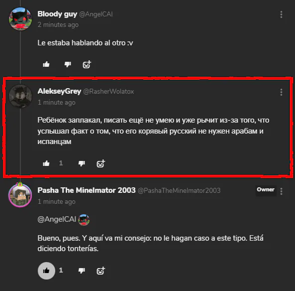 SPA: Mientras estaba ocupado traduciendo este juego del desarrollador de un amigo al ruso, todo se fue al traste. Recibí comentarios sobre cómo era un "traductor torpe al ruso", en serio. Y entonces le dije que se fuera a la mierda por hablar así. Luego seguí trabajando en ello, y de nuevo, recibí una respuesta de un comentarista que decía: "El niño se puso a llorar, todavía no puedo escribir, ¡y ya estoy llorando porque escuché que su ruso torpe es inútil para los árabes y los españoles!". Estaba furioso, y aunque no entendió a @AngelCAI