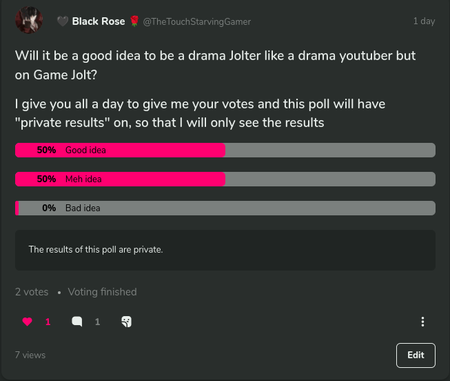 Oh well... Looks like I need to think about it myself, why? The poll haves a tie, so I will think about being a "Drama Game Jolter" myself If I think about it... Drama Game Jolters should have a community for themselfs