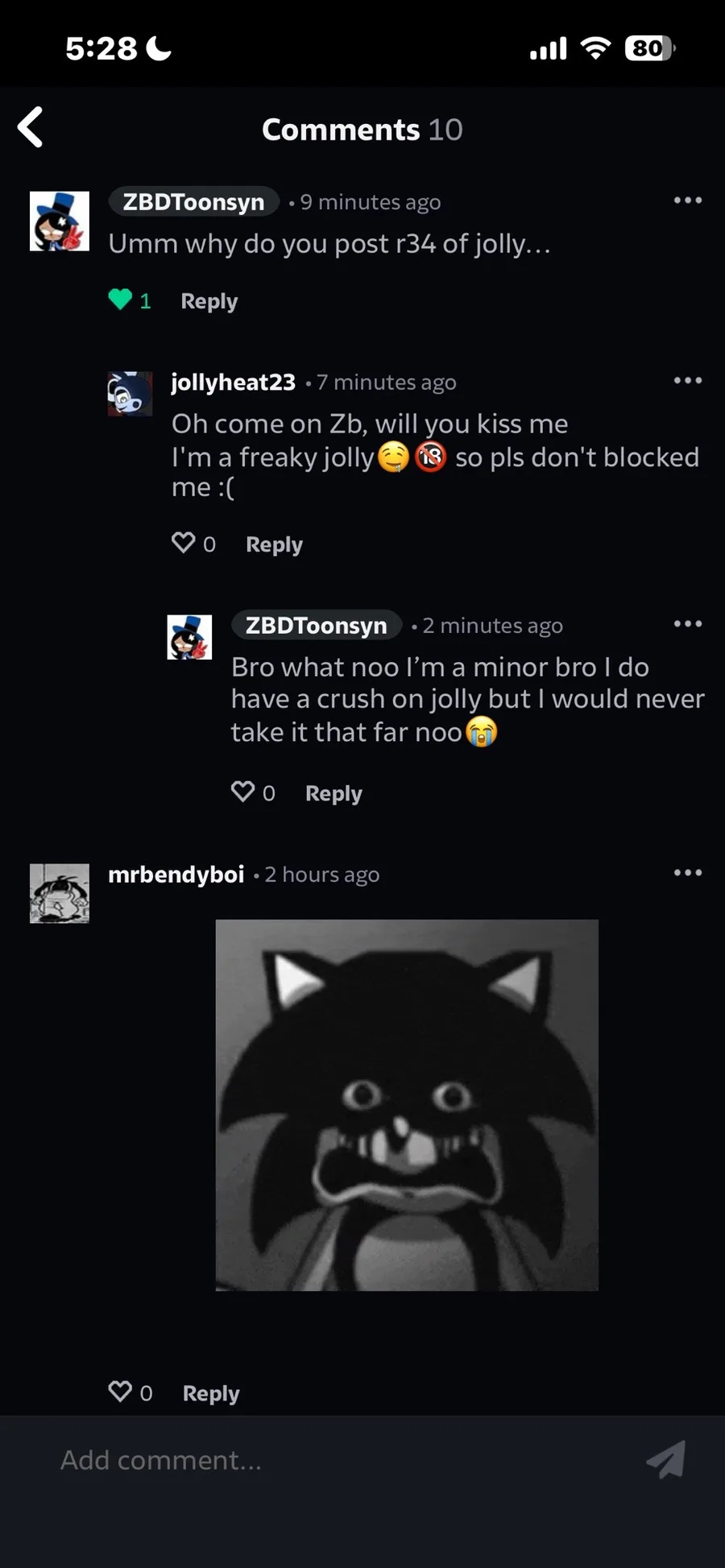Guys wtf did I just find in my deviant art this person is literally posting r34 of jolly and they said this to me like wtfπ