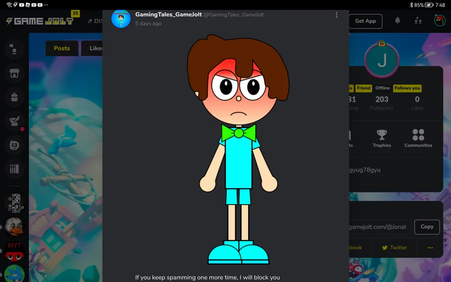 thank you gamejolt administrators for shadowbanning them over a joke, what a great and trustworthy platform