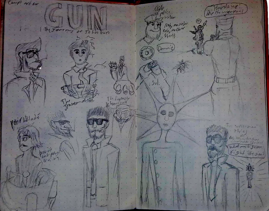 Starting to work on a game called JohnGun, I won't share much here except for early (old and now redesigned) character sheets for some of the characters.