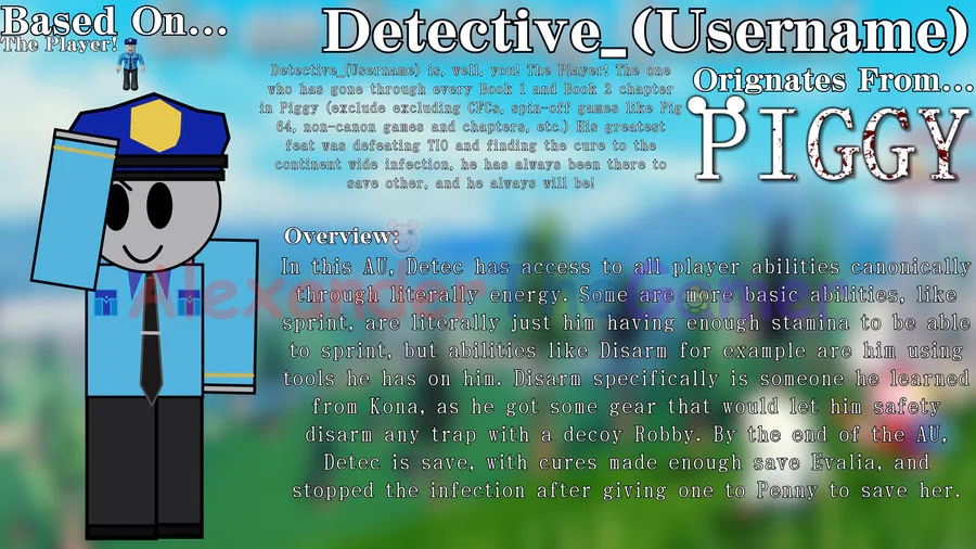 Detec and Eny have remade! I decided to change her name to Eve as it's closer to Evie and I didn't realize that "Eny" isn't a proper name. All of my OCs will be changed in how I make them. to make a long story short, it's gonna take a while to fully make every single one, however Detec and Eve get to stay since they've already been made, they'll be Series 2: Roblox Piggy. Series 1, 3, 4 will come out once they're ready!