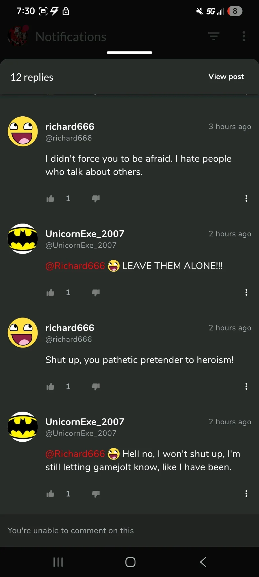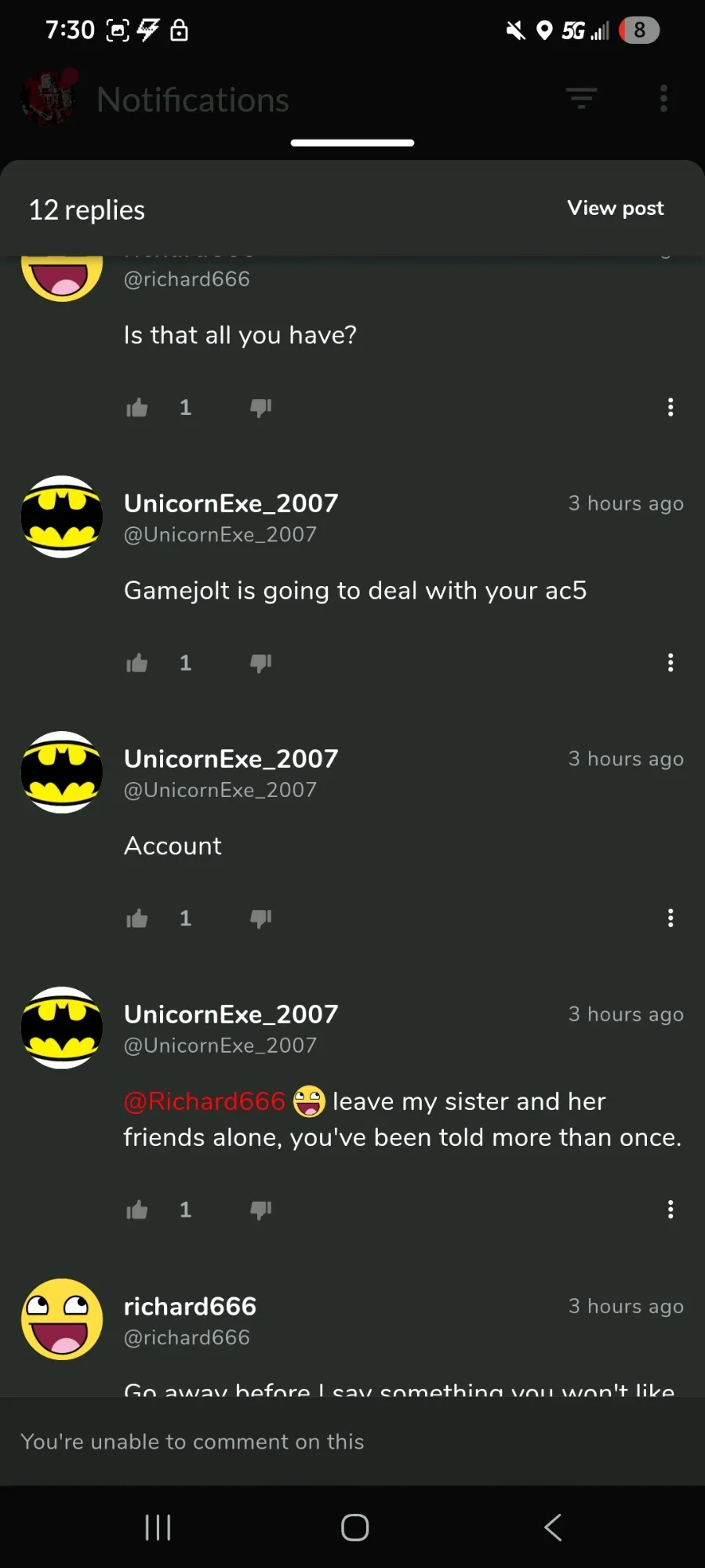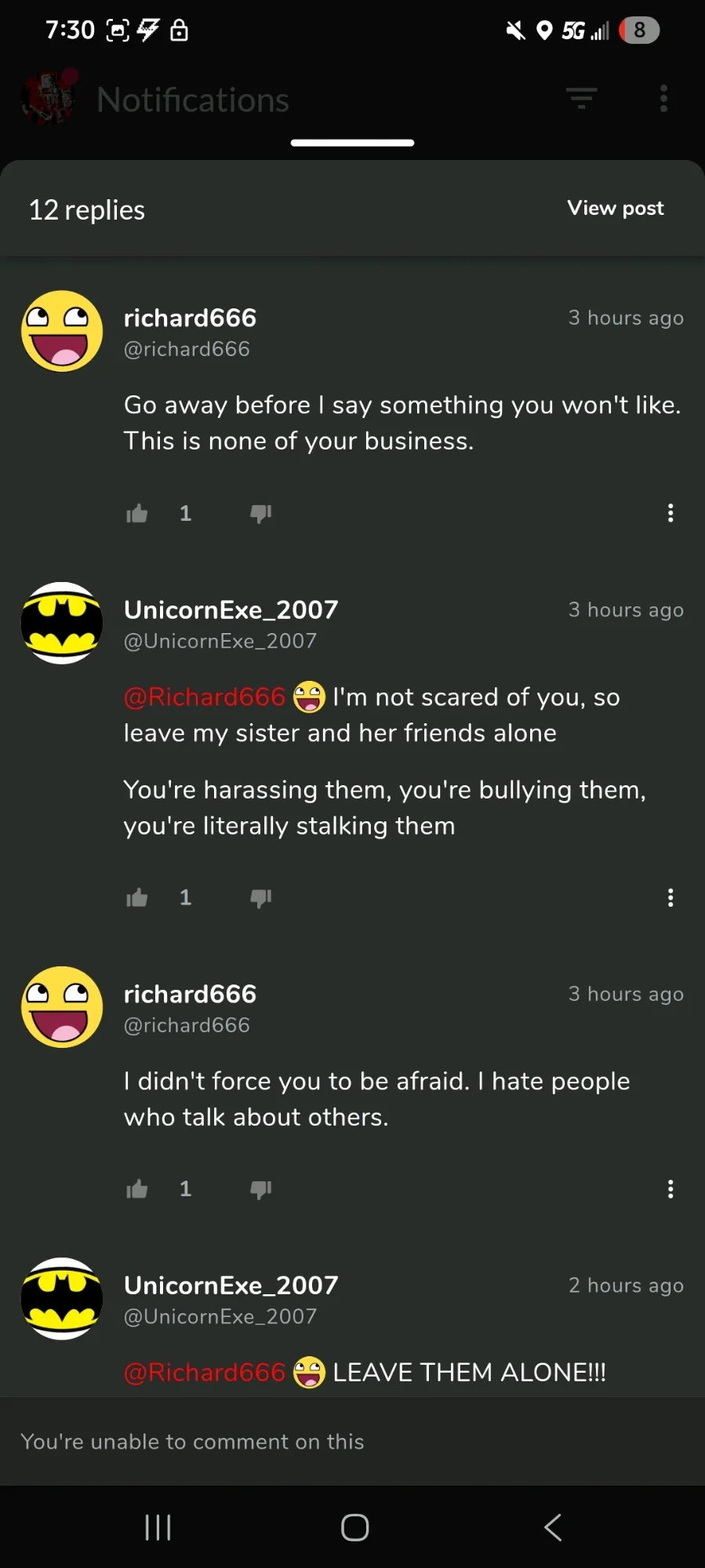 He is harassing one of my friends again.