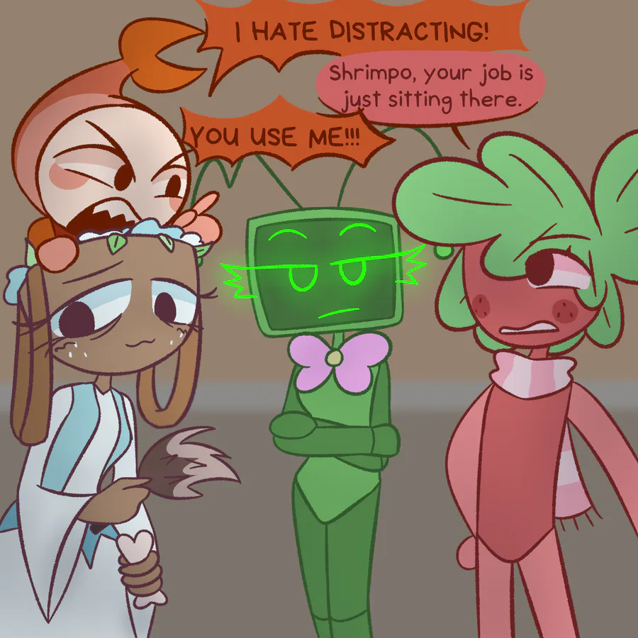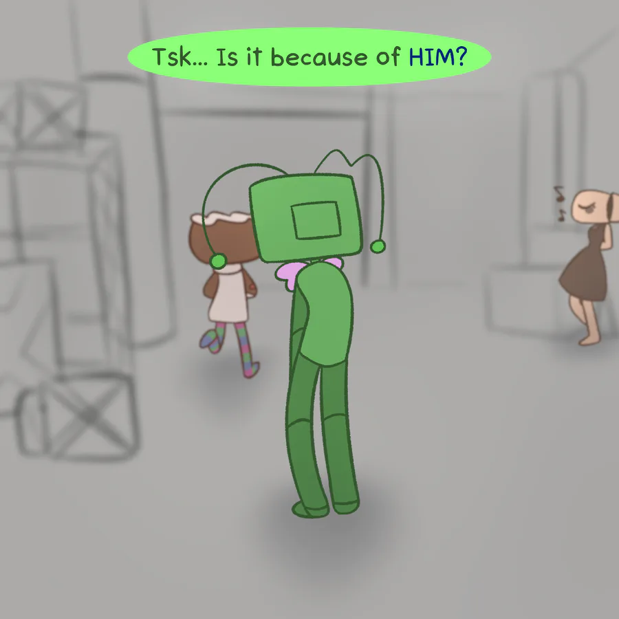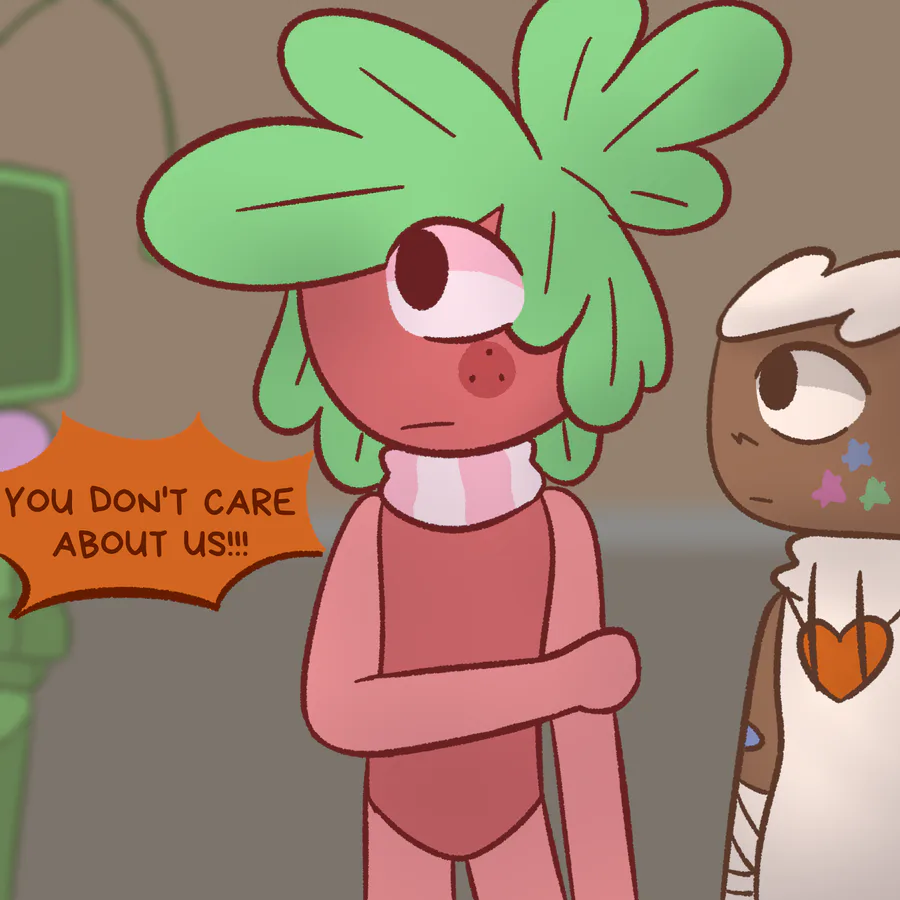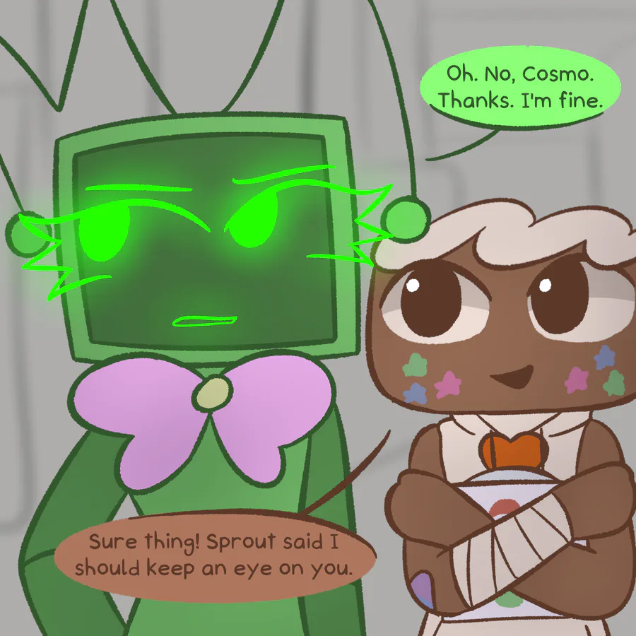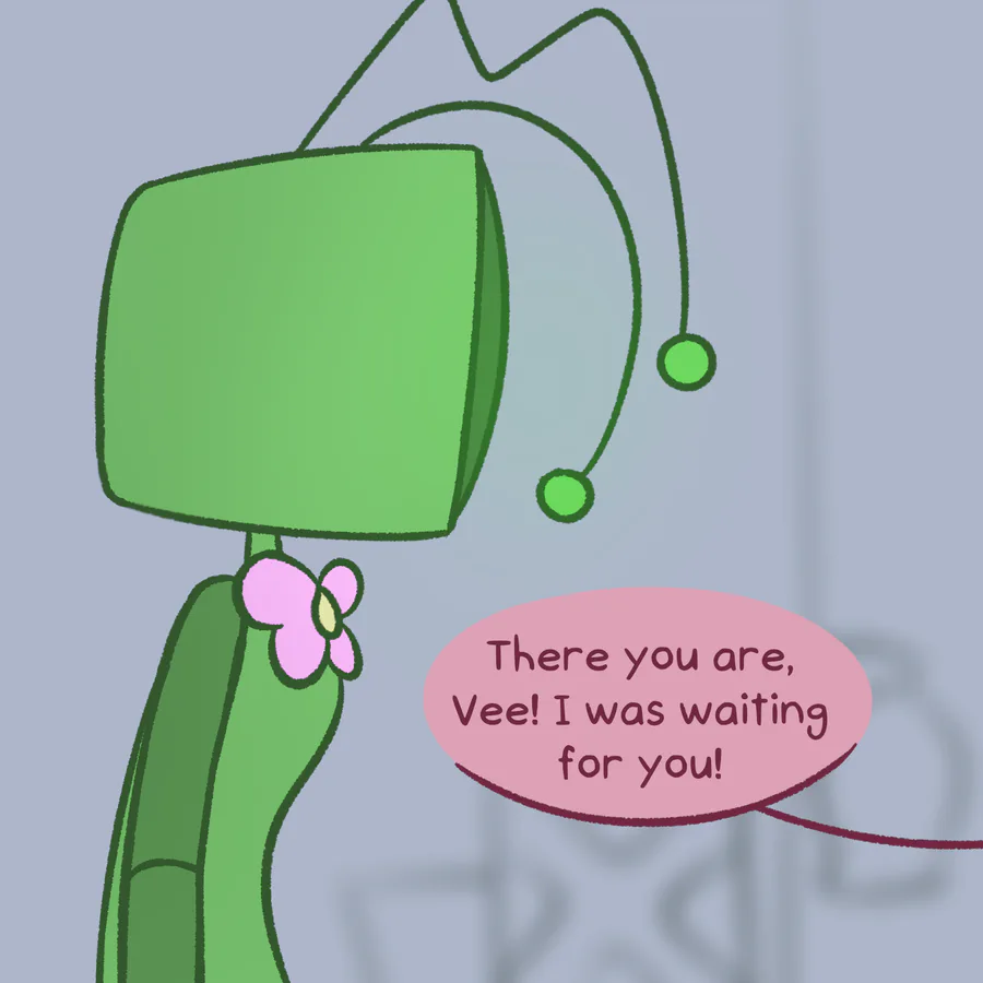 Nothing special. Vee does her job as usual, but she feels troubled by the thought of what love really is. In her understanding, love is caring, but looking at how Cosmo and Sprout care for others, she begins to doubt caring as a manifestation of romantic love.