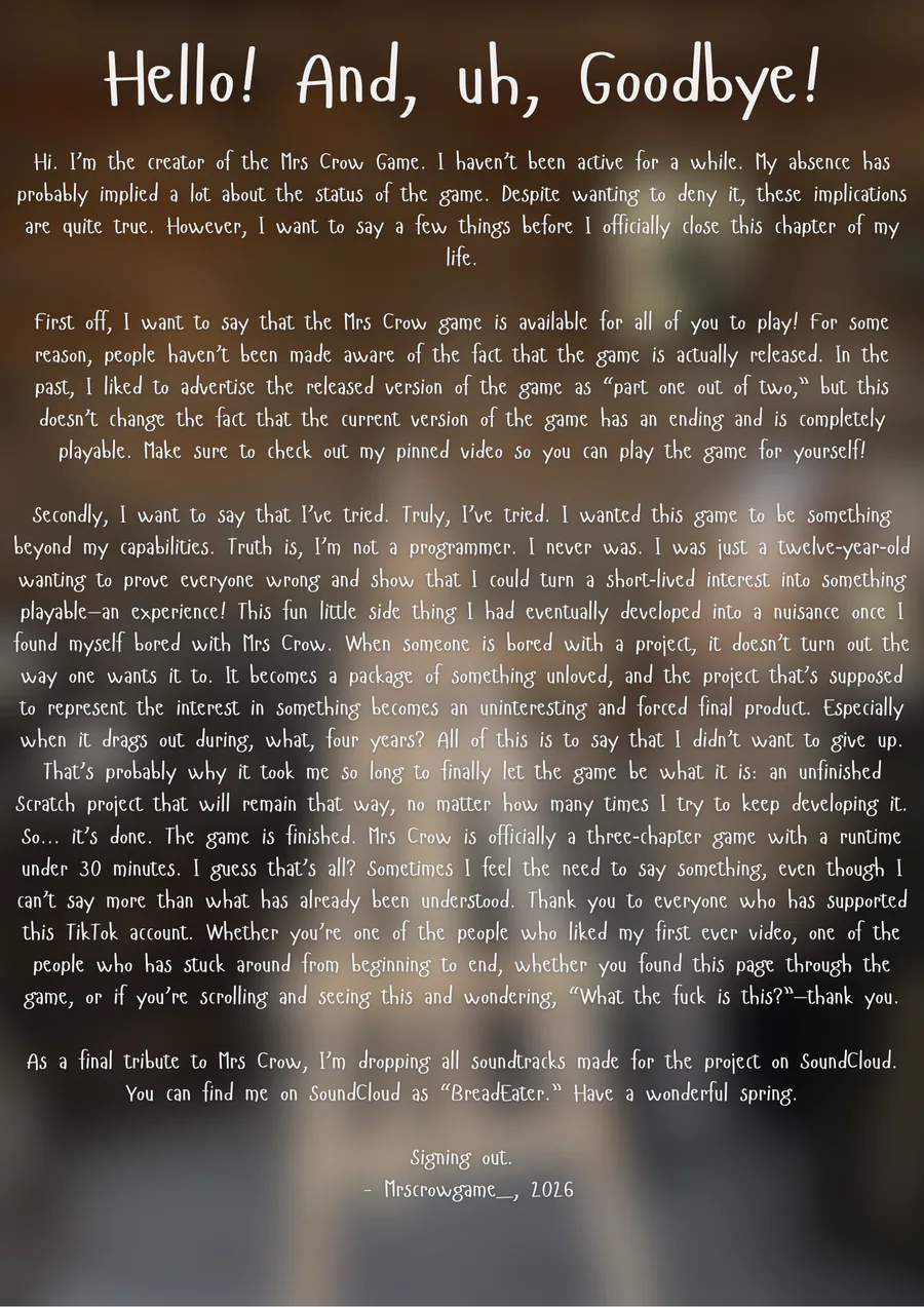 Hello! This is the gamejolt page for Mrs Crow! Here are some fun facts about the game;