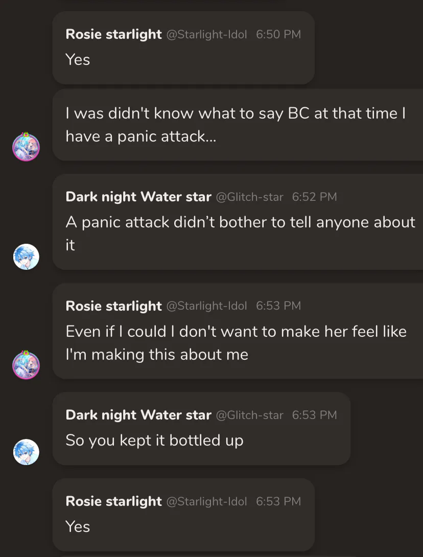 So it turns out Rosie starlight had a panic attack and she wasn’t doing well. This is also during a time where I believe she was talking to one of her friends I won’t be naming them because this is something personal. She also did make it about her so she kept to herself
