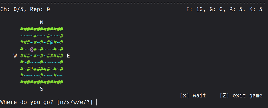 I really love crawling mazes. Especially when I need to race another adventure (blue @) for a wreck with loot (brown P). The adventurer uses Tremaux algorithm to efficiently cover a lot of maze is short time. This involves a simple machine-learning AI.