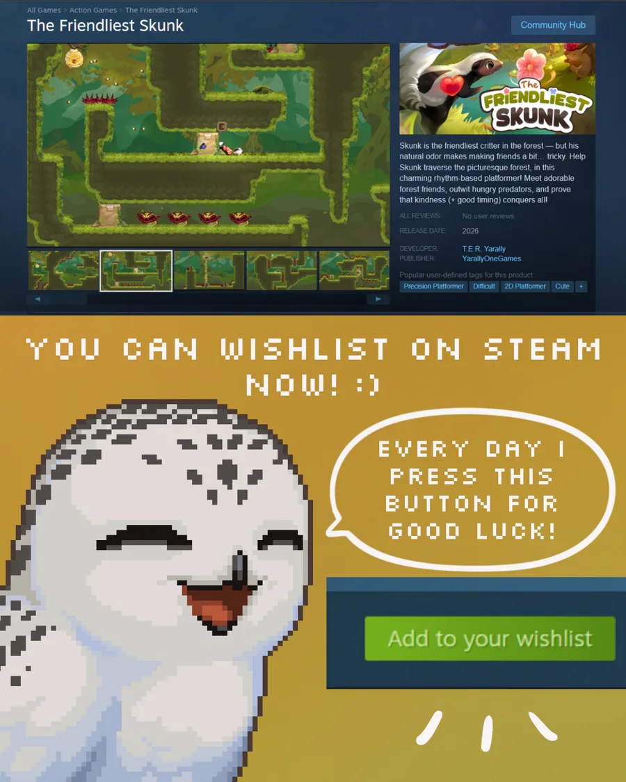 Wishlist The Friendliest Skunk on Steam now! https://store.steampowered.com/app/3833330/The_Friendliest_Skunk
