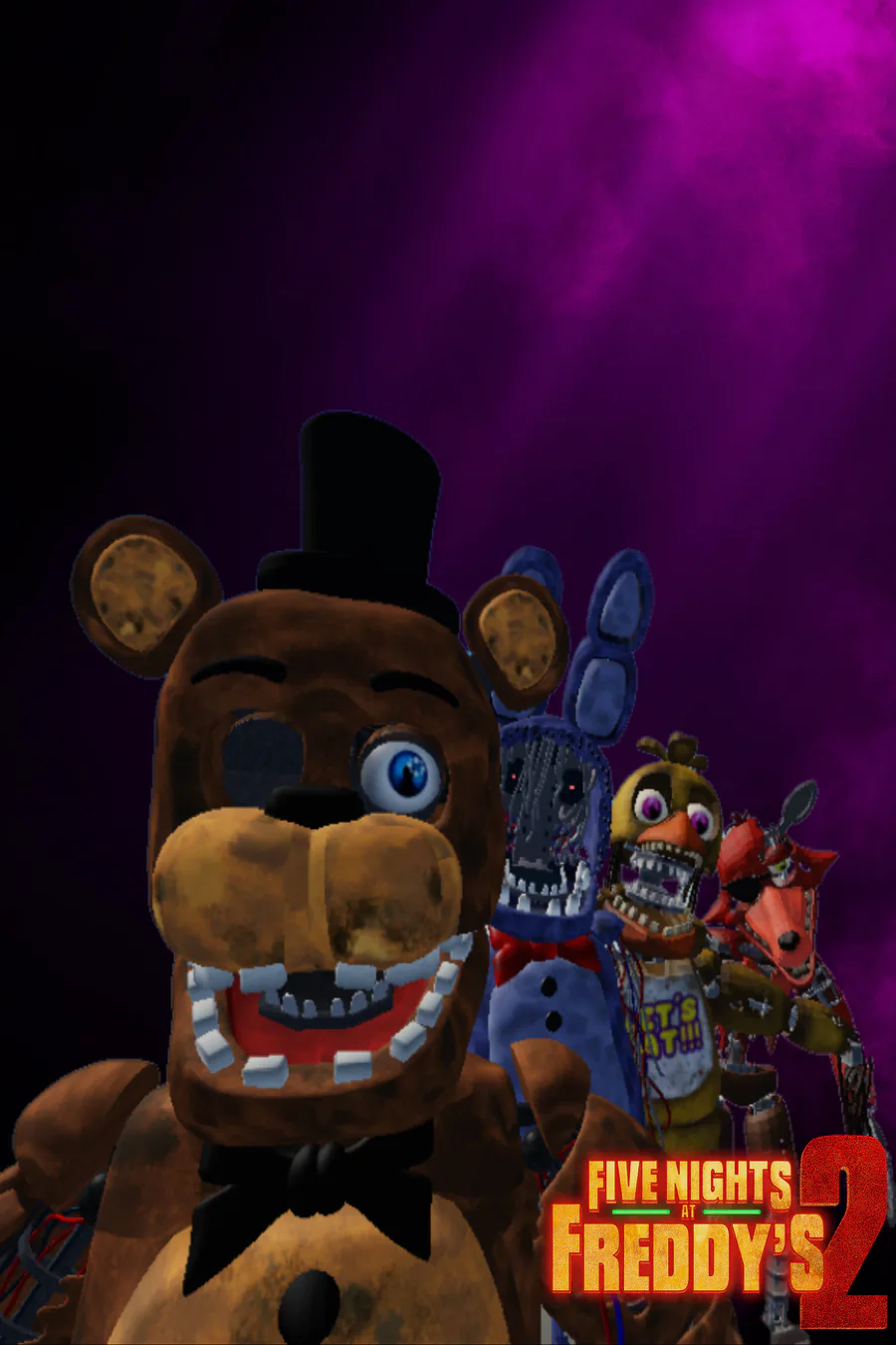FNaF 2 Movie poster i made using roblox studio and paint 3d (i do not own any of those assets used in image, i just used them as a way to show how my way of making a withered animatronics poster would look like in the style of the fnaf 1 movie poster)