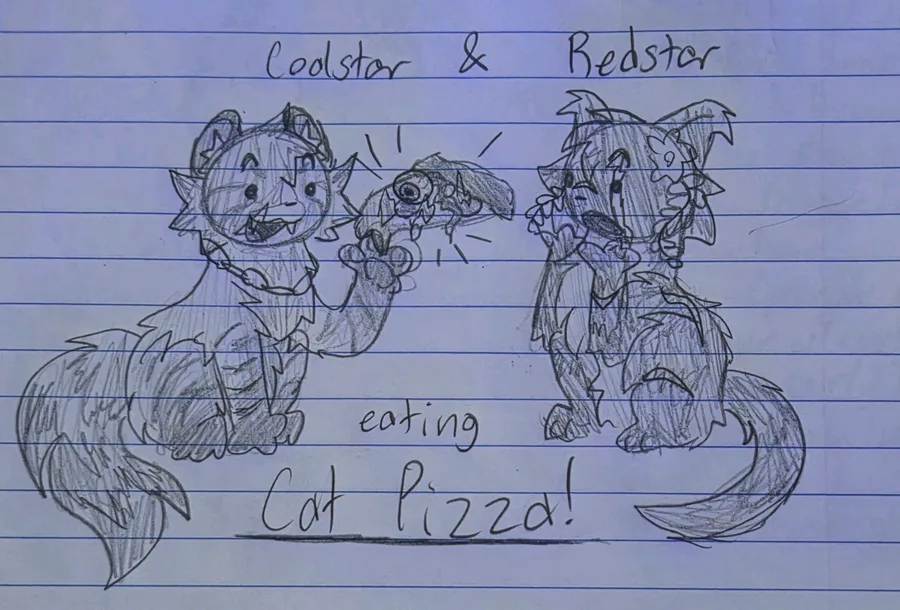 Coalstar and Redstar (owned by a friend!) eating cat pizza! Because they are cannibals in all yk yk yk heh