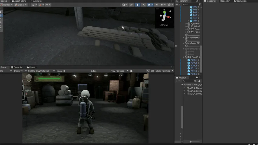 ScreenShot SandBags Barricade - OverallSuitMan - GalponBase Level Design. #b3d, #blender, #unity, #game, #panel, #box, #energy, #electrical, #switch, #panelBox, #warehouse, #overallman, #switchElectrical.