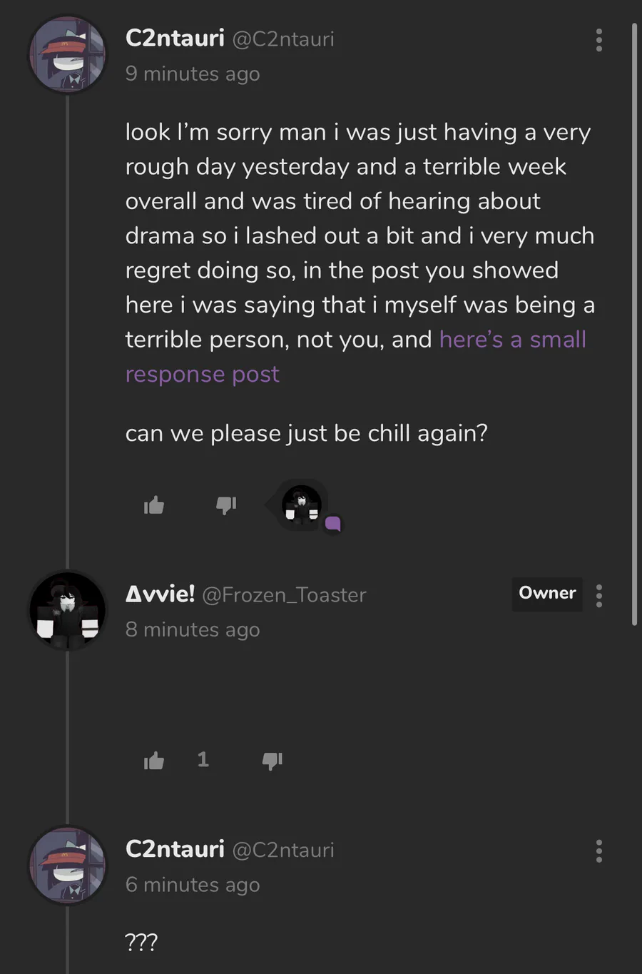can someone please talk to avvie i just can’t get through to him that im sorry for what I’ve said and done…