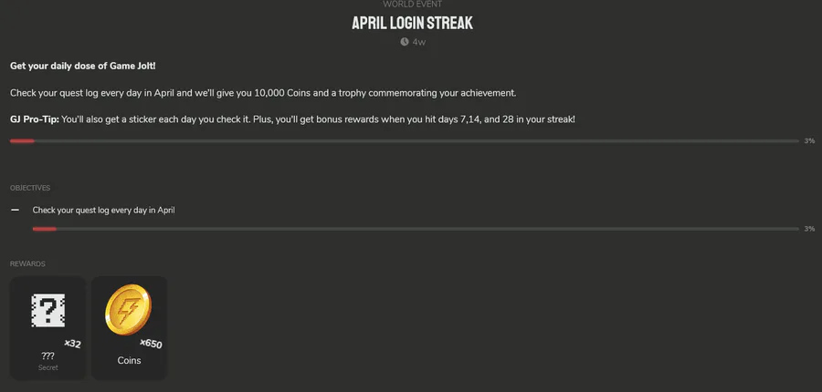 "Check your quest log every day in April and weβll give you 10,000 Coins and a trophy commemorating your achievement." Where is the 10,000 coins, & trophy? I think something went wrong setting this up? Just wondering.