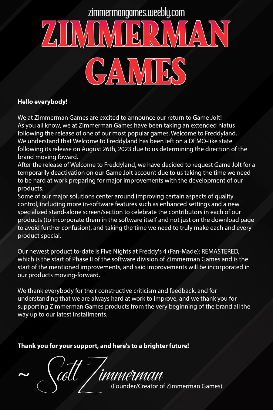 ~ Scott Zimmerman (Creator of Welcome to Freddyland and Founder of Zimmerman Games)