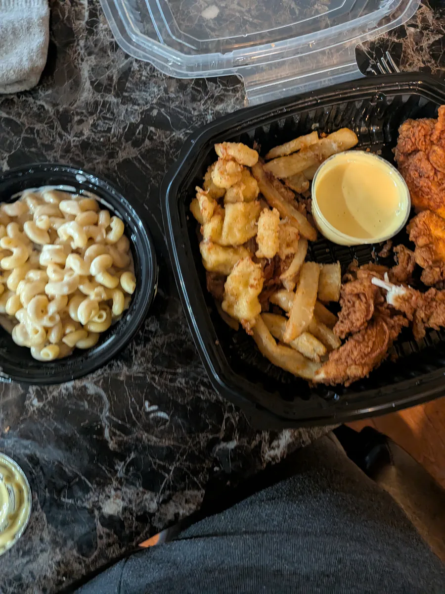 Chicken tenders fries mac and cheese and cheese curds🤤
