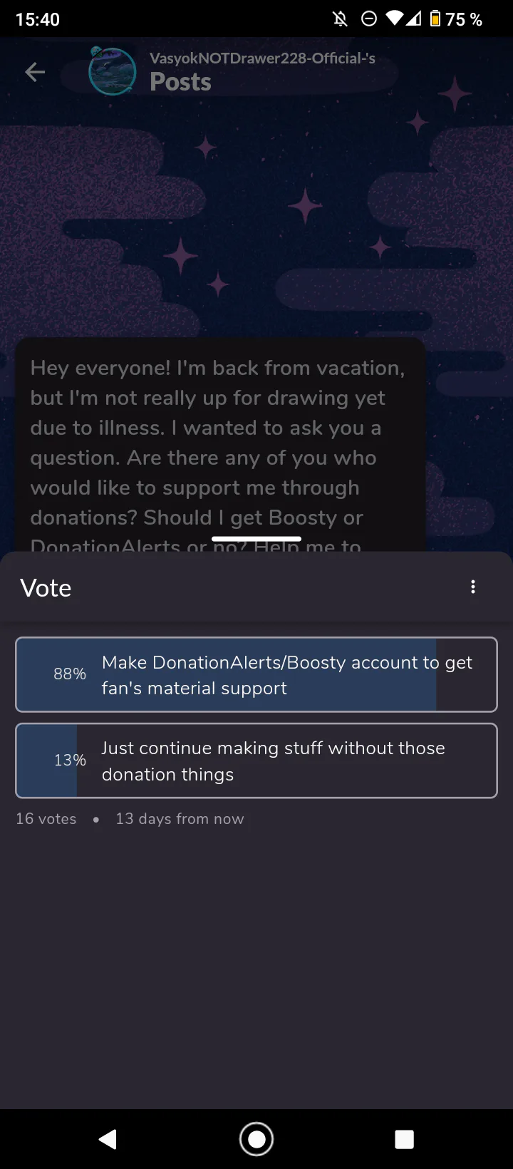 Hey, guys. I wanted to say something about this poll. I was thinking about it and decided one thing: I won't get DA/Boosty account, because I don't need it. Also because I couldn't register there. So... The poll about it is meaningless now. Sorry for it.