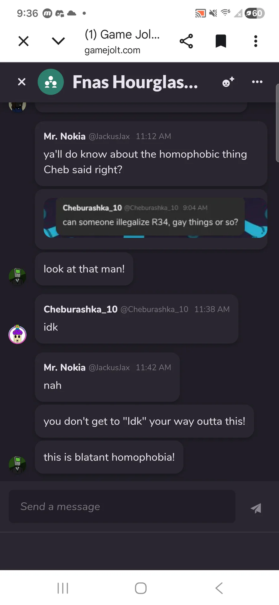 who is one of rhe devs of the original fnas dc has recently started to be homophobic sadly and here are the following images to proof that im not lying but also his user won't show in the other images