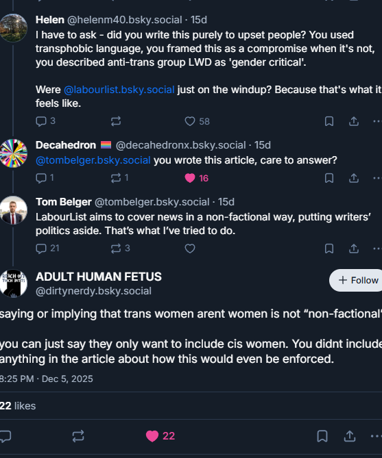 if you ever forget how fucking woke bluesky is, just look at this. 15 days ago. not a single fucking like on the stinky transphobes comment, TWENTY ONE FUCKING REPLYS.