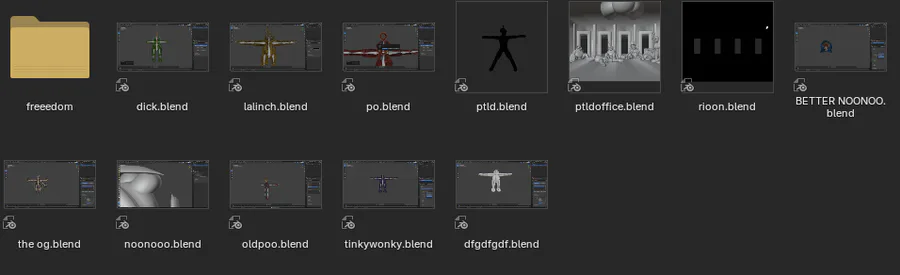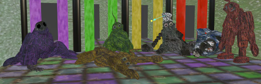 So ive been going back and looking at the metrick fuck-tons of old blender models ive made and seen here is 3 from around April 2024. The first one was a game about 3 bears that I made a mfa for and some code but was abandoned because I still had no idea how to use blender with clickteam to make games. The second one with two images got pretty far, it was a remake of FNATL 3. everyone was coded but I had no clue how to code nights… So yeah it died pretty quick but I still have a ton of memories for it. The last there was gonna be a game that took place in a submarine and you had a weird coral mask and the only enemy i think i made for it was a weird blob thing.