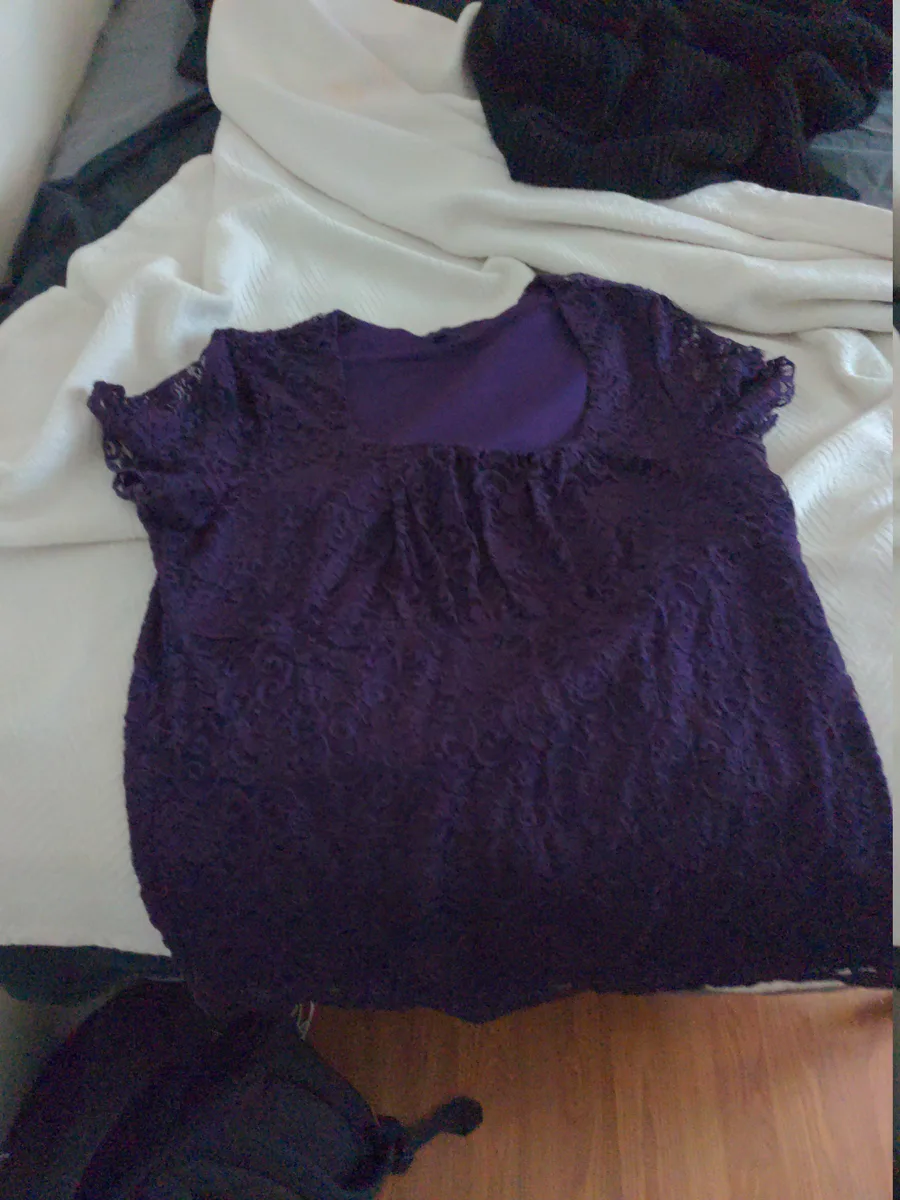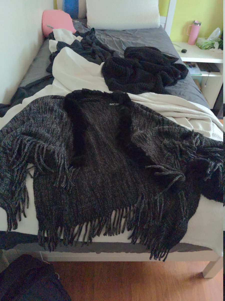 2 SHAWLS (ON3 GR3Y AND BLACK W1TH FUR AND ON3 PLA1N BLACK) AND ON3 PURPL3 LAC3 SH1RT <3