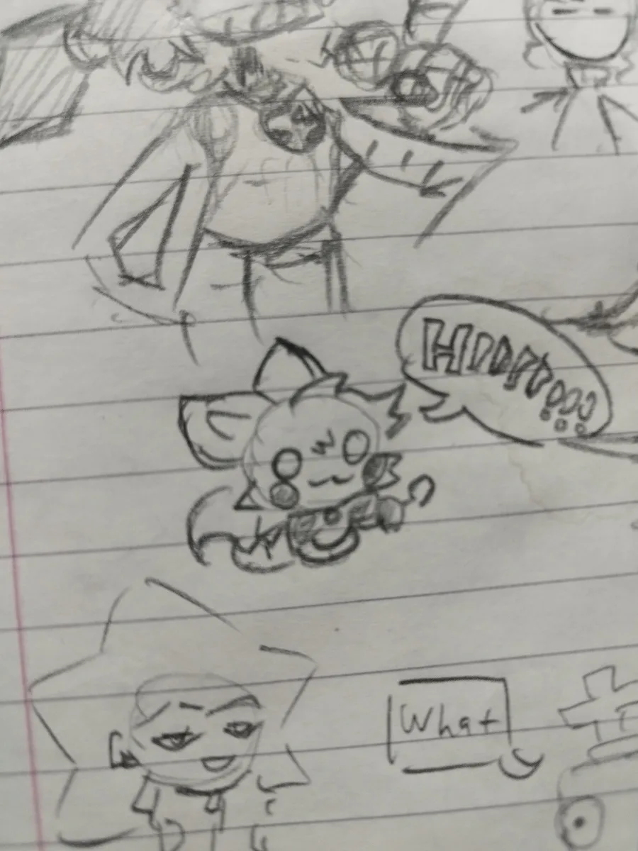I was digging in my closet and found an old notebook with drawings of otez and my old mini sona (might honestly go back to the soulless dot eyes I dunno