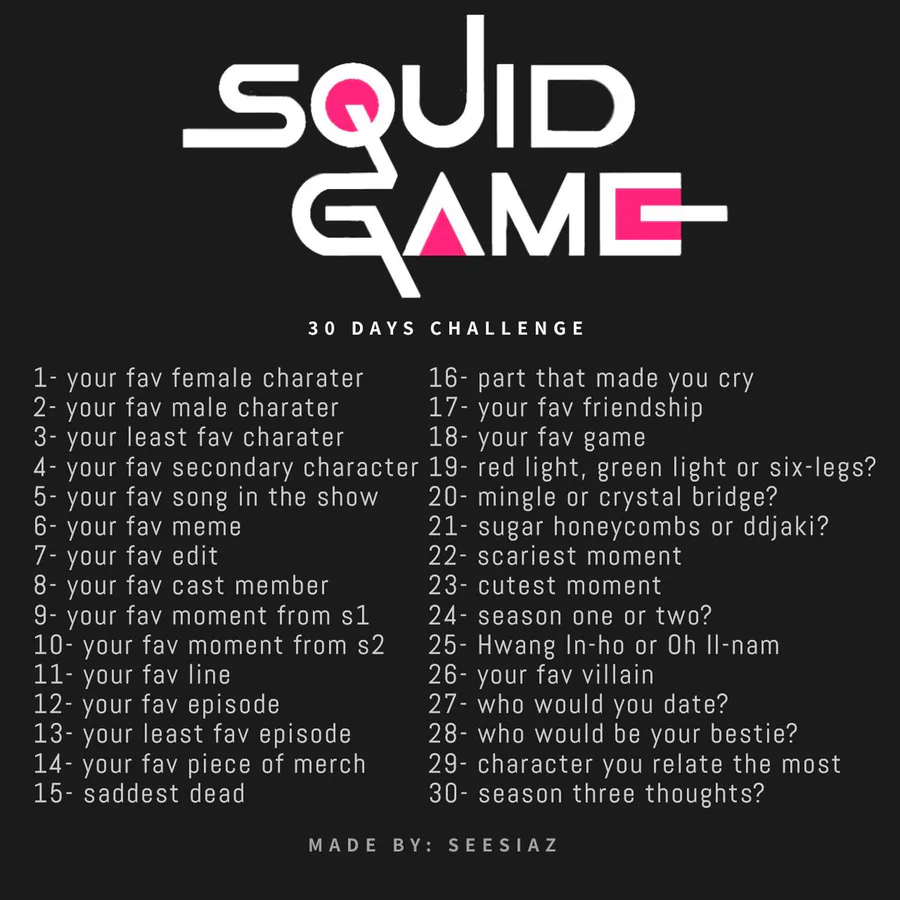 starting this squid game 30 day challenge thingy lol *might be doing more season 1 than 2 and 3*
