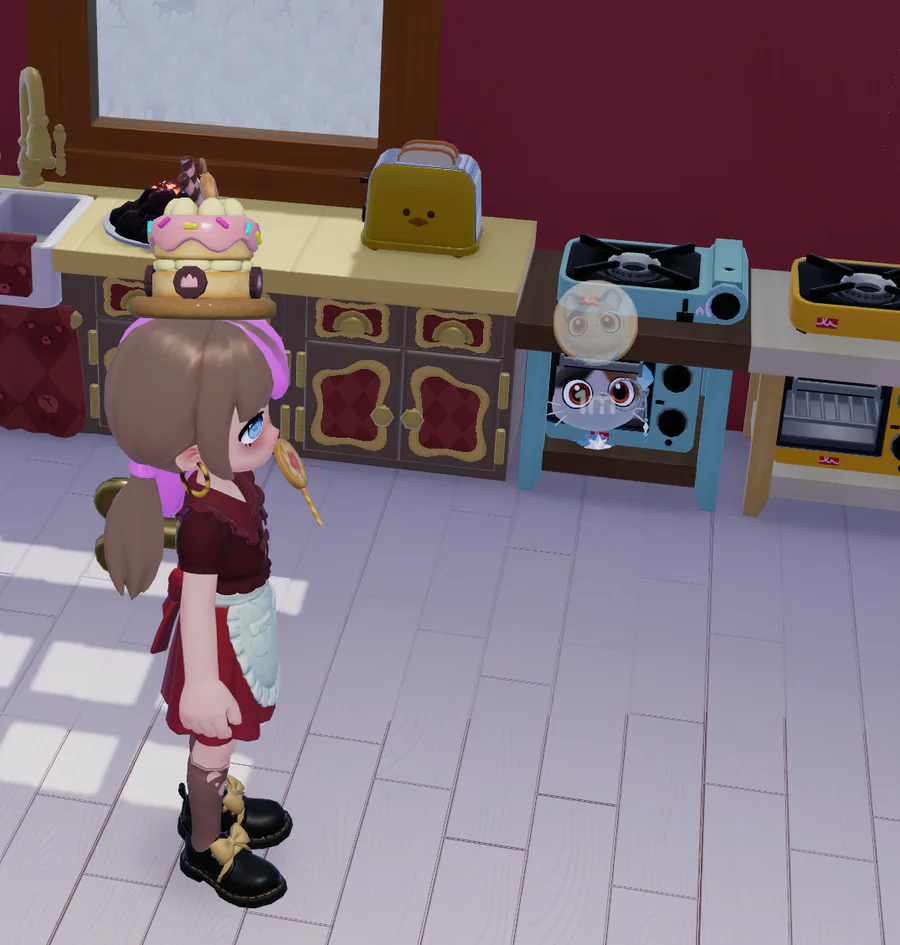 Hello. I'm playing Heartopia. My cat thinks the oven is her bed.