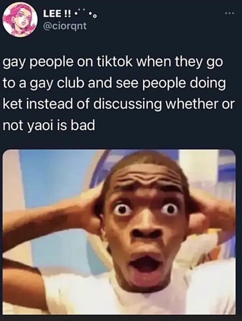 telling a buncha bar queens I'm defending their community from unrealistic fire emblem slashfiction or fucking whatever and then walking into the bathroom and screaming when I see two pairs of feet in one stall