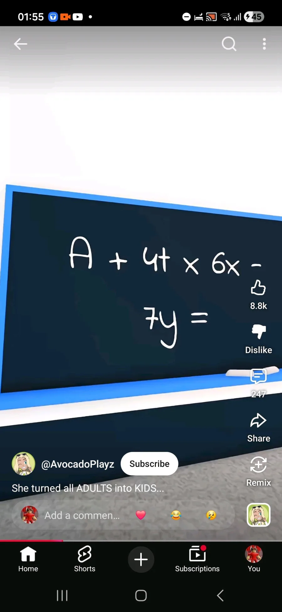 "Math": Look at that board. A + 4t x 6x - 7y? This is what a "fucking bum" thinks math looks like. There’s no logic, no solution, just a stroke on a chalkboard. actual code while she’s shipping fake equations for 5-year-olds.
