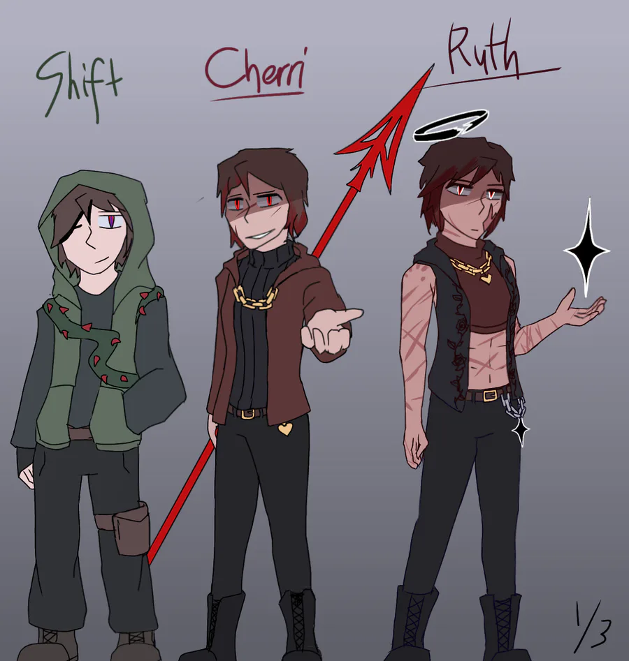 Shift, Cherri and Ruth are all my versions of already ecisting undertale AUs, Storyshift, Storyfell, Storyfellfell(?)