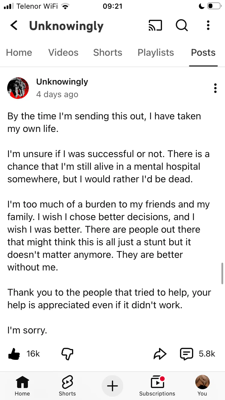 One of my favorite youtubers called Unknowningly posted a post couple days ago saying that he was mentally unwell and planned to end his life.