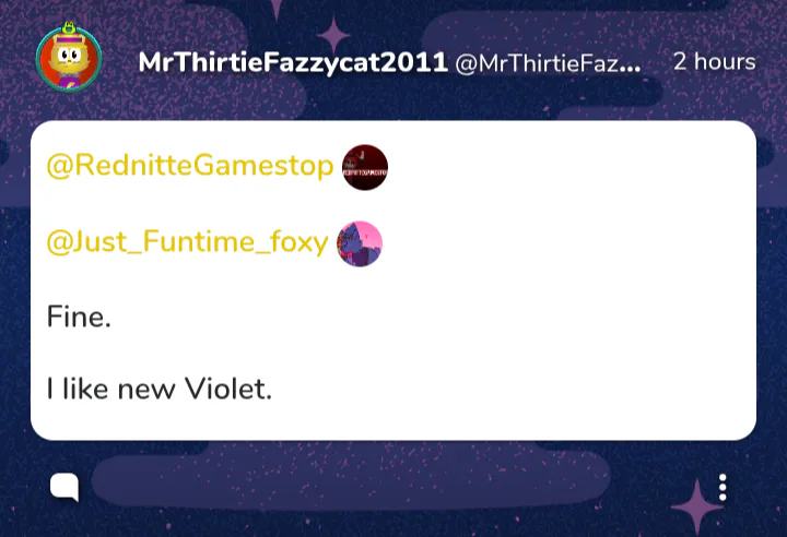 He apologized But also yes i was I agreed with RednitteGamestop about The Game And decision But I decided not to risk things so as not to make everything worse again If Just_Funtime_foxy hates me so much But @ViviTheautistic