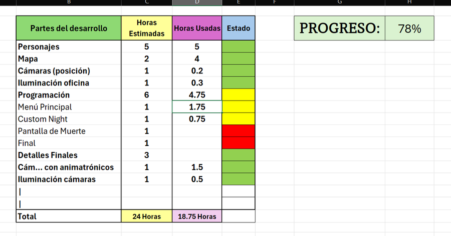 Aquí nuestra tabla de progresos hasta ahora, creo q me voy a enfocar en el gameplay. Talvez no me de tiempo de programar el apartado "continuar noche" y hacer más noches pero mínimo habrá custom night.