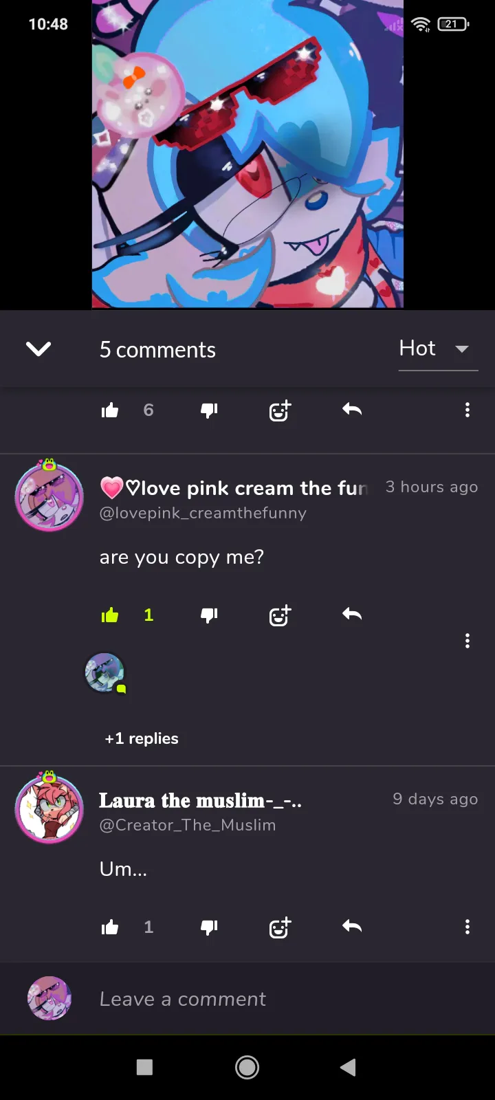 um guys? why my copycat love my comment and some one commet her but she not love it? i think she love my oc i think :/ ( @lovelightblue_skylarthefunny