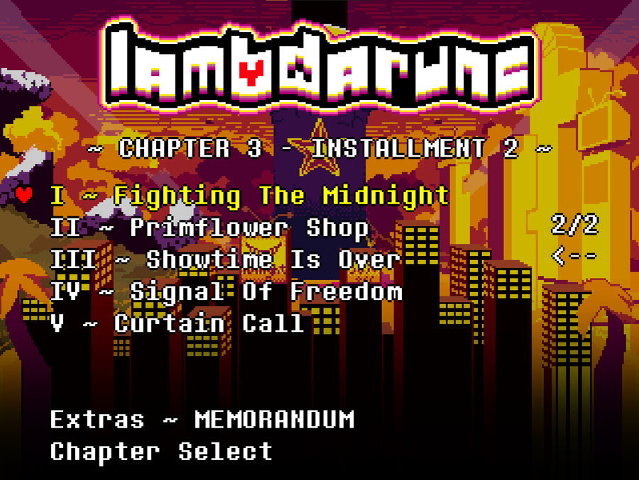 It's for good reason that Chapter 3 has taken so long to complete— ZeroKay has only been coding for about a year but still managed to make a full battle engine, along with 3 high-effort fights. As you may know, LAMBDARUNE was initially planned to be shown as an animation instead of a game— the sudden switch to the game medium is why Chapter 3's development became so convoluted. Fortunately, Chapter 4 onwards is prepared for the game medium and will not have these issues.