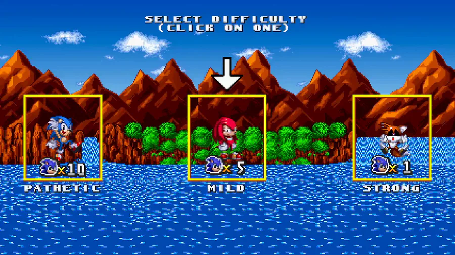 remade the difficulty selection screen since i didn't like the old one green hill sprites aren't mine btw... credit to this person (https://www.deviantart.com/pierreelvro31/art/Green-Hill-Zone-Rem…)