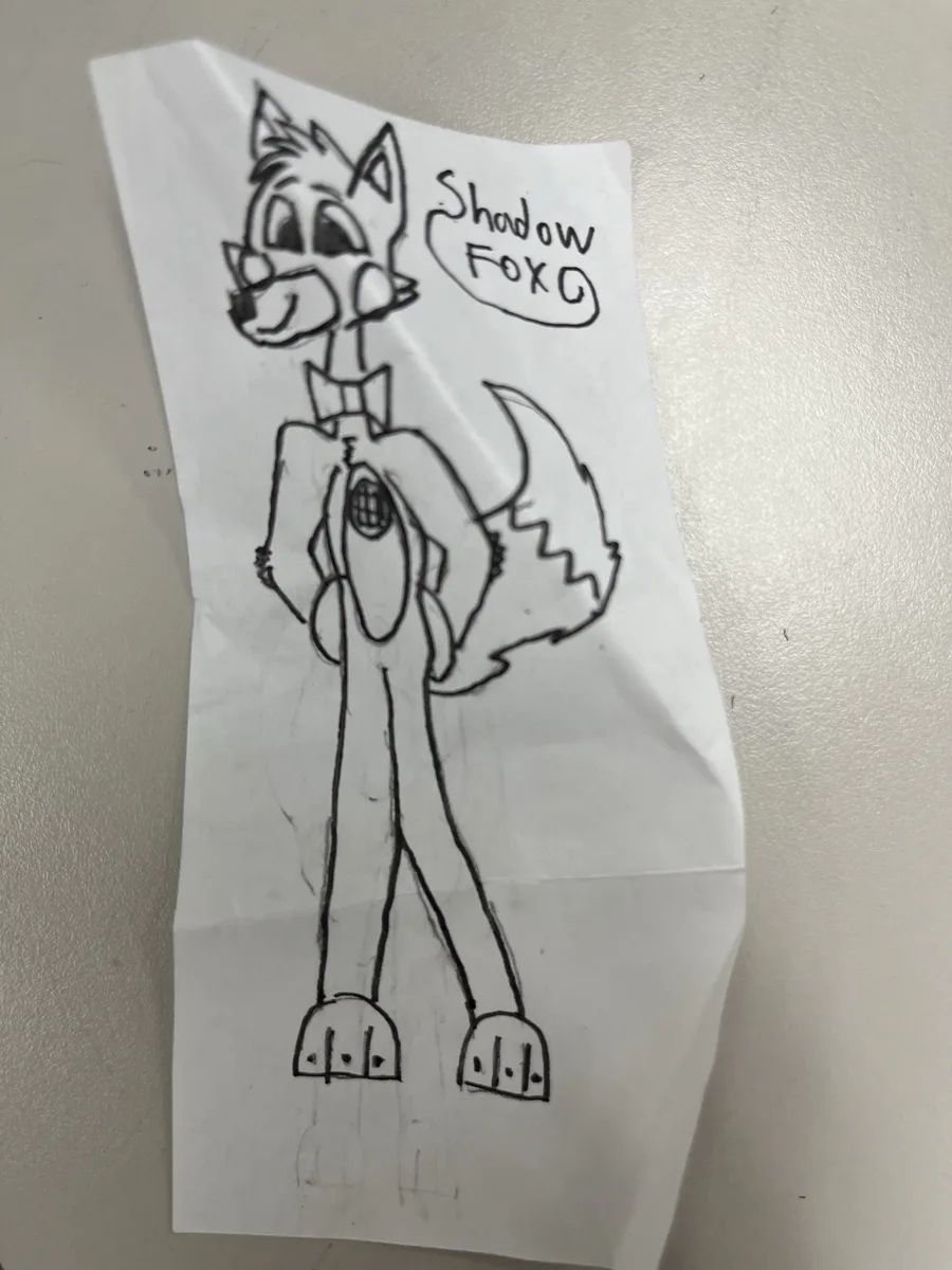 also this is when my sona became more of a fnafsona instead of a fursona, outside environment kinda forcing me into changing him from a fursona and into a fnaf oc. His name being ShadowFox became fully canon at this point, the speaker has been removed from his chest.