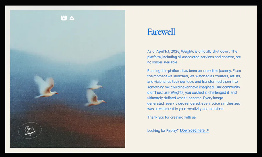 It's honestly sad to this website shutting down, especially since I started using this website back in late 2024 if I remember correctly when I really wanted to make AI Covers, since AI Covers back in 2023 and 2024 were really popular at that time with using AI voice models of fictional characters and mixing them with vocals from a random song that they could sing, however this wasn't only reason I started using Weights, I started using it because Kits.ai's shared voice models became private due to a update that made the voice models private, and the fact that Weights was free with no payment for generating AI Covers.