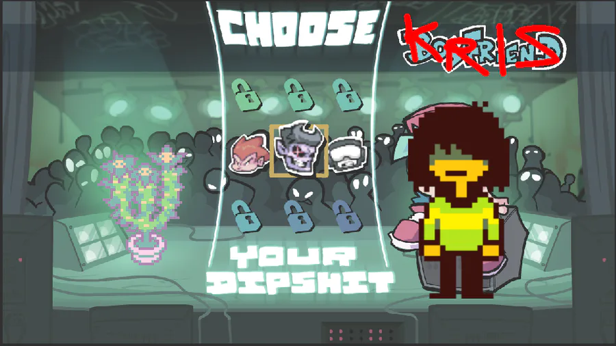 if i were to make a FNF Halloween Hack mod i would replace BF and GF with Kris and Cactus and DD and MM with Asgore and Toriel