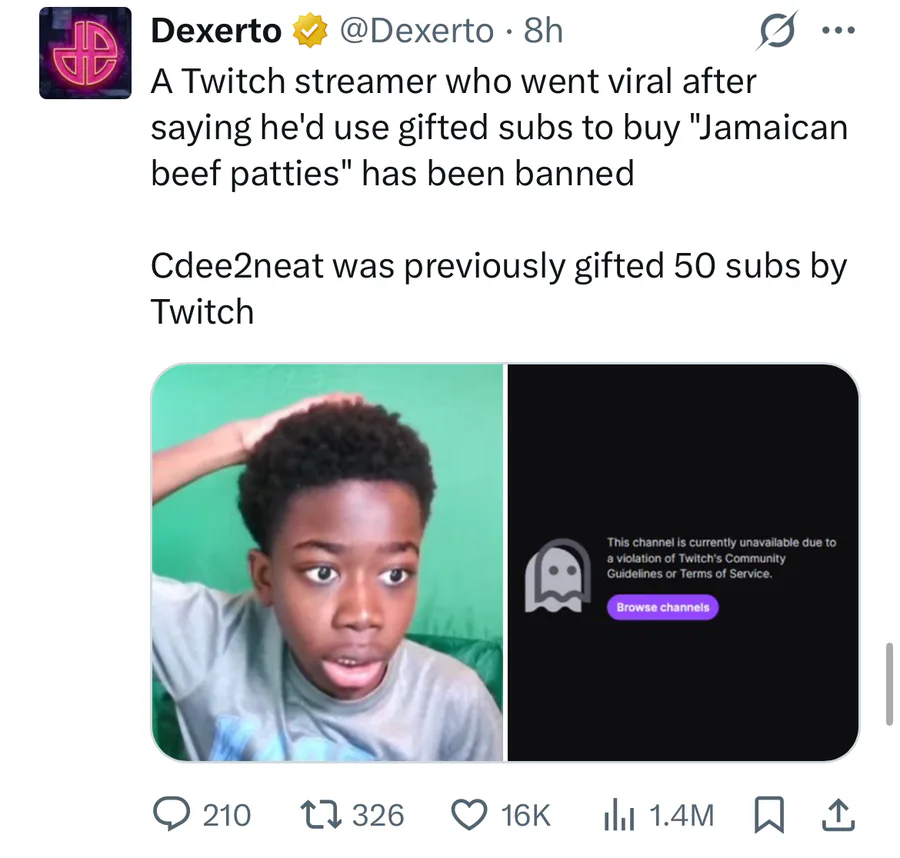 This twitch streamer about the kid was basically being viral after using a gifted subs to buy “Jamican beef patties” has been banned