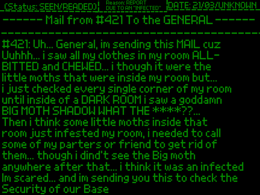 "3210# Was found Dead in the Nurses section in our base getting eated by Parasites... It seems that the Bites of that Infected are very "Dangerous"... We will need to Explore again but with more Tubbies... this is getting Dangerous..." (AU)