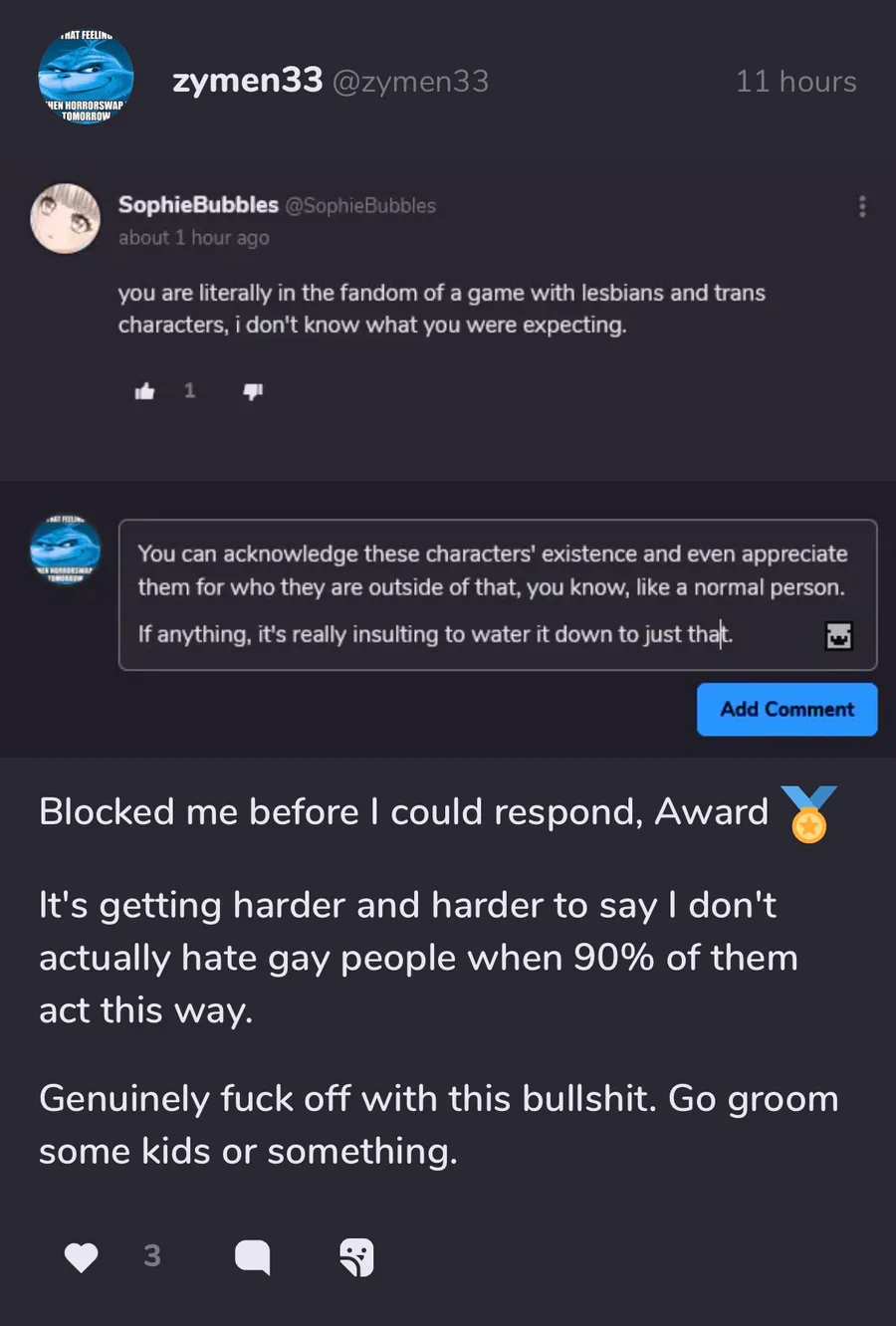 hi all. i normally do not like to call out people publicly on social media for being pieces of shit because i have a life. this is an exception because this person has posted about me to be a transphobic asshole.